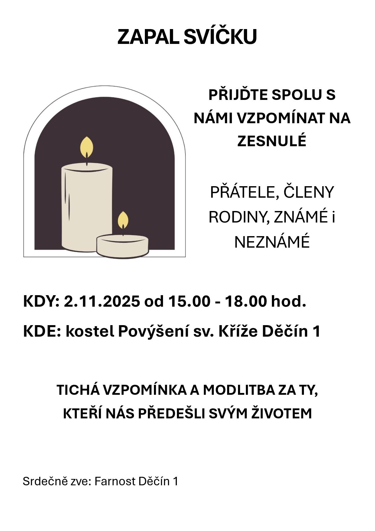 Nabízíme "na Dušičky" blízkost a prostor i čas ke vzpomínání a modlitbám za zesnulé všem sousedům bez rozdílu víry či vyznání.