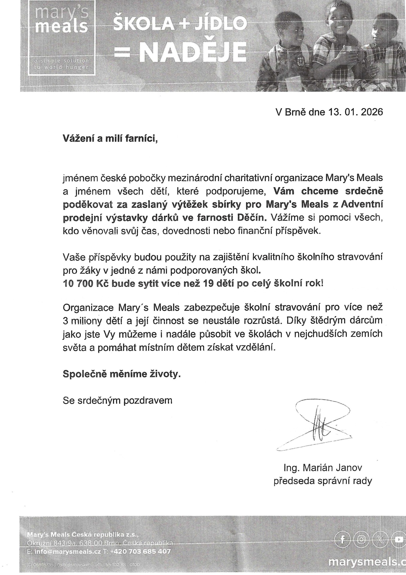 V roce 2025 - 2026 podporujeme: Mary's Meals poskytuje školní stravování dětem žijícím v nejchudších komunitách světa. Příslib kvalitního jídla přivádí hladovějící děti do školních tříd, kde se vzděláním získávají i naději na lepší budoucnost. Pro mnohé z těchto dětí je jídlo od Mary's Meals jediným pokrmem celého dne. Dává jim energii, kterou potřebují nejen k tomu, aby do školy přišly, ale také aby se soustředily na vyučování.